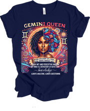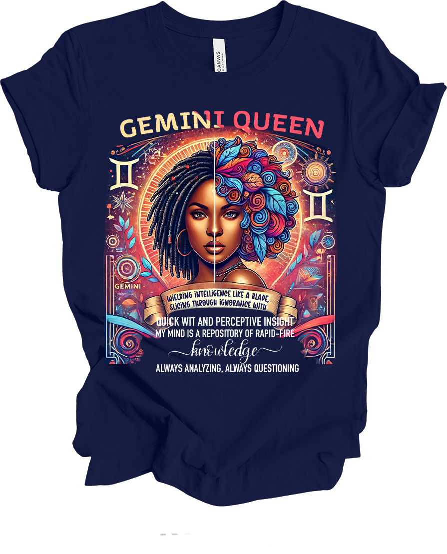 The perfect shirt for the Gemini who lights up the world with her sharp mind and endless curiosity. Made from premium Bella Canvas, it's crafted from 100% Airlume combed and ring-spun cotton for that perfect blend of softness and durability. Unisex fit. Printed and shipped from Charleston, SC. Color: Navy blue.