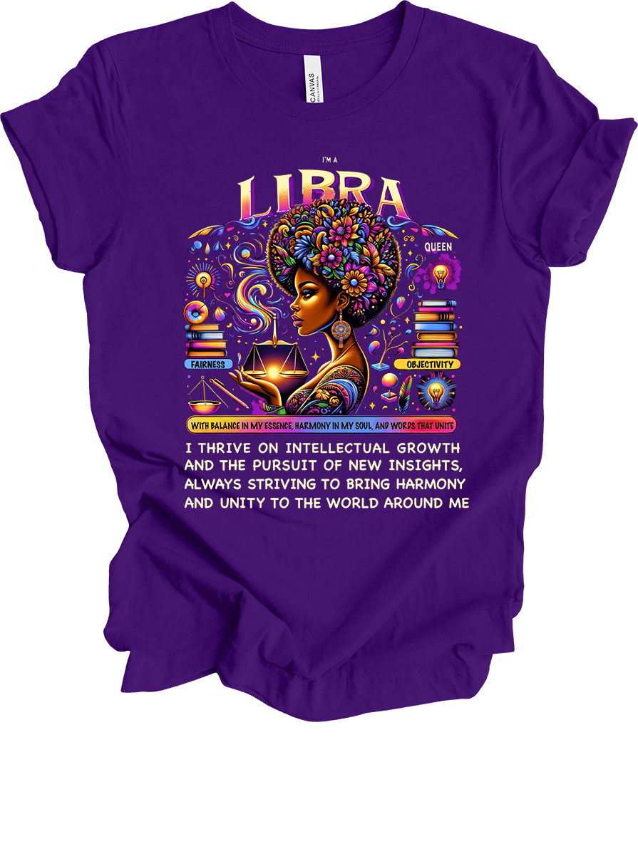 The perfect shirt for the Libra queen who inspires others through her quest for insight and balance. Made from premium Bella Canvas, it's crafted from 100% Airlume combed and ring-spun cotton for that perfect blend of softness and durability. Unisex fit. Printed and shipped from Charleston, SC. Color: Purple.