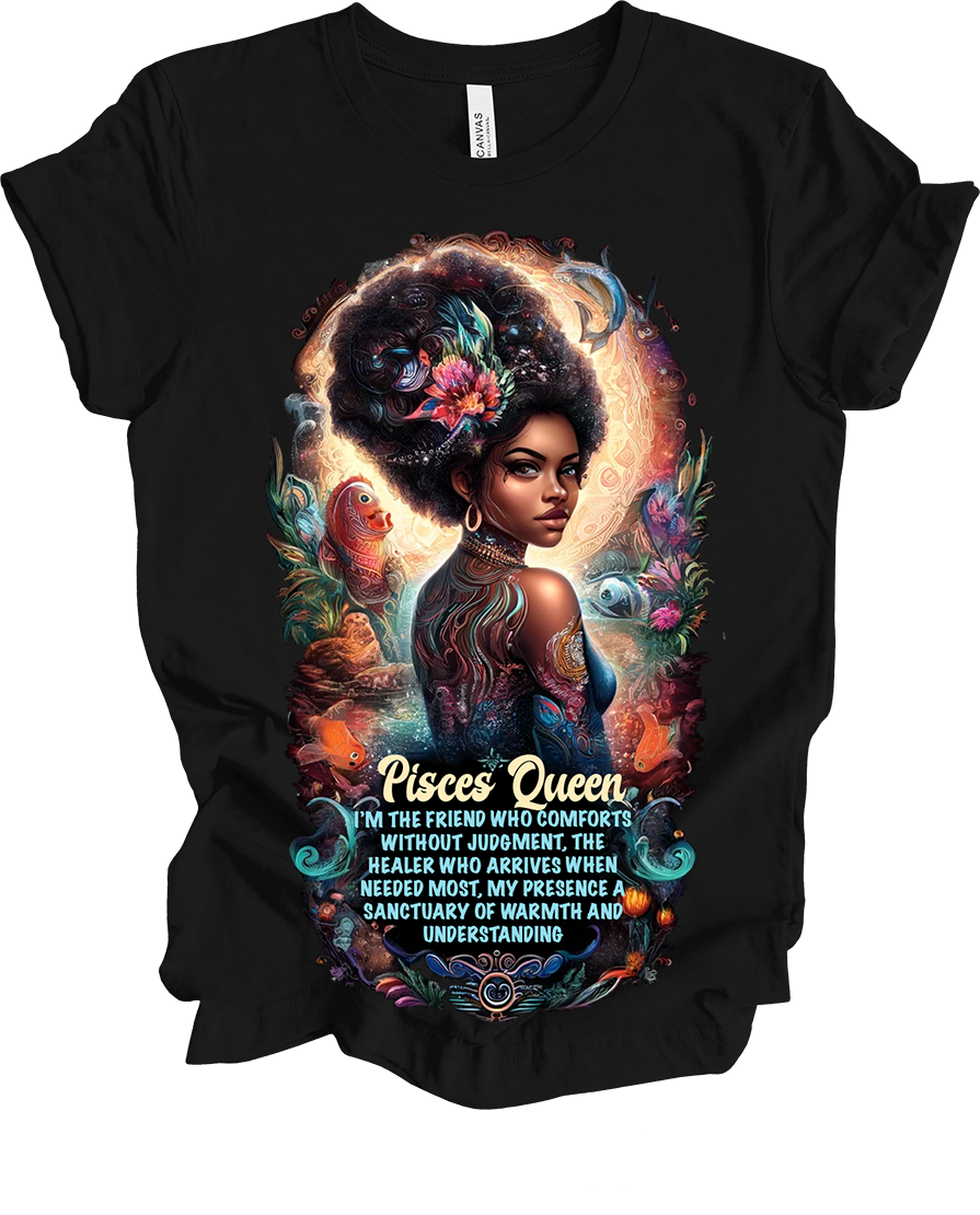 The perfect shirt for the Pisces queen who offers solace without judgment and kindness without limits. Made from premium Bella Canvas, it's crafted from 100% Airlume combed and ring-spun cotton for that perfect blend of softness and durability. Unisex fit. Printed and shipped from Charleston, SC. Color: Black.
